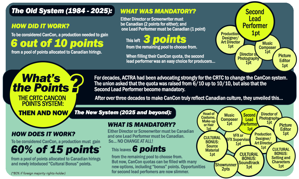 The new system now expands to 15 points, introduces cultural bonus points, and opens eligibility to a wider range of jobs, from showrunners to VFX, SFX, and various design departments. CanCon eligibility is now triggered by achieving 60% of the 15 available points – which now includes interchangeable additional off-screen positions and “Cultural Bonus” points.